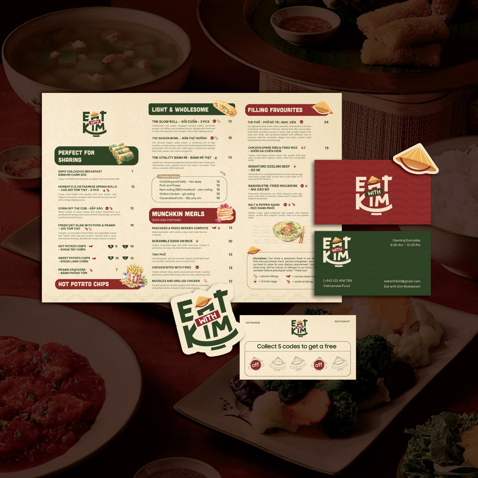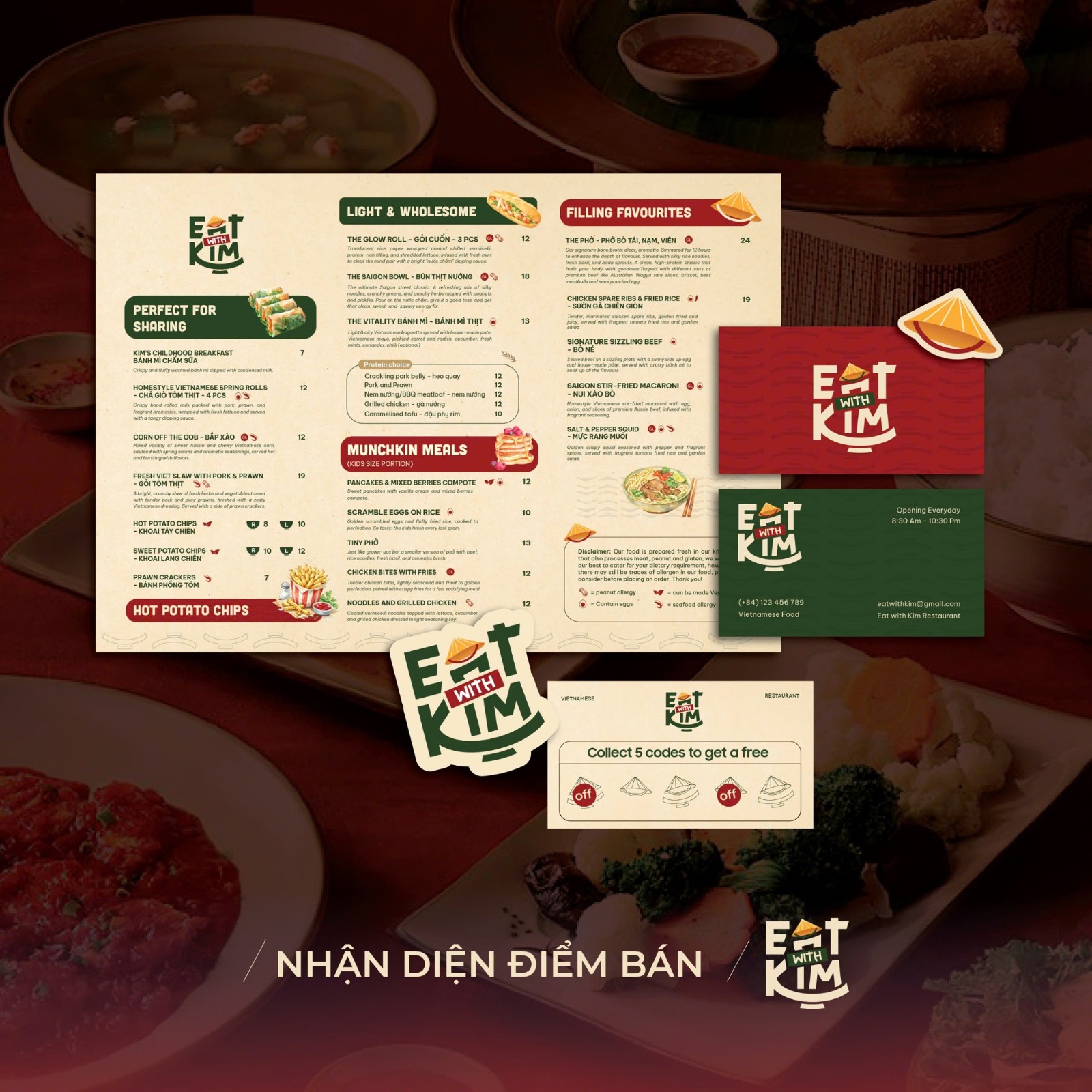 Bên cạnh đó, các illustration nhỏ minh họa món ăn được lồng ghép khéo léo giúp menu trở nên sinh động hơn, đồng thời tạo điểm nhấn thị giác cho từng danh mục. Thiết kế logo và các yếu tố nhận diện như card, sticker hay thẻ tích điểm cũng được triển khai đồng bộ, góp phần xây dựng một hệ thống nhận diện điểm bán nhất quán cho thương hiệu Eat with Kim.