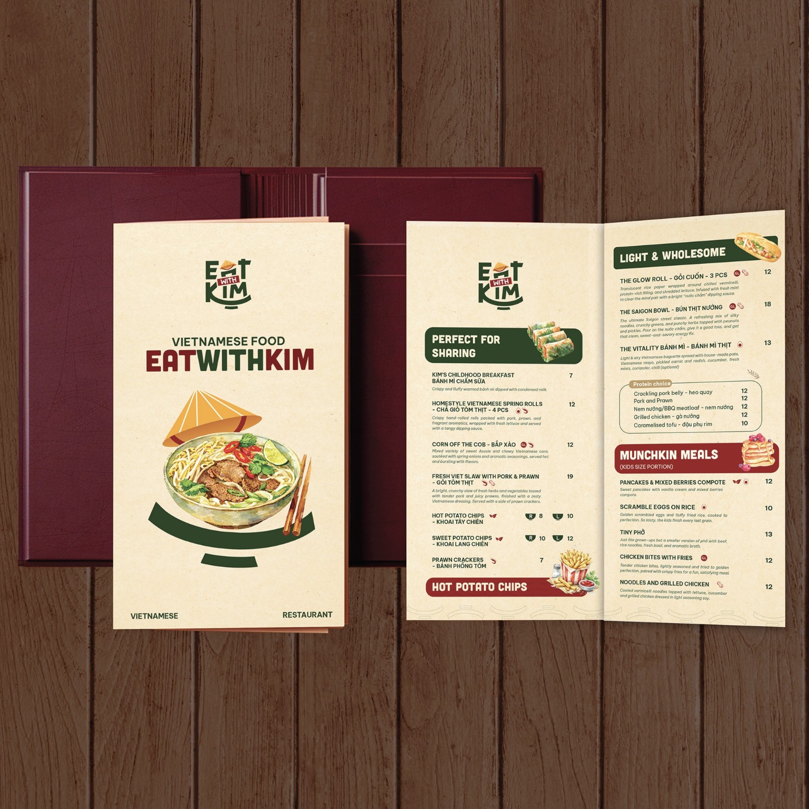 Trước khi thưởng thức món ăn, thực khách thường chạm vào menu đầu tiên. Một thiết kế menu chỉn chu không chỉ giúp khách dễ dàng lựa chọn món, mà còn là cách để nhà hàng truyền tải phong cách và câu chuyện thương hiệu của mình. Với dự án thiết kế menu cho Eat with Kim, Bee Art đã xây dựng một hệ thống nhận diện điểm bán vừa rõ ràng, sinh động, vừa mang tinh thần ẩm thực Việt hiện đại.