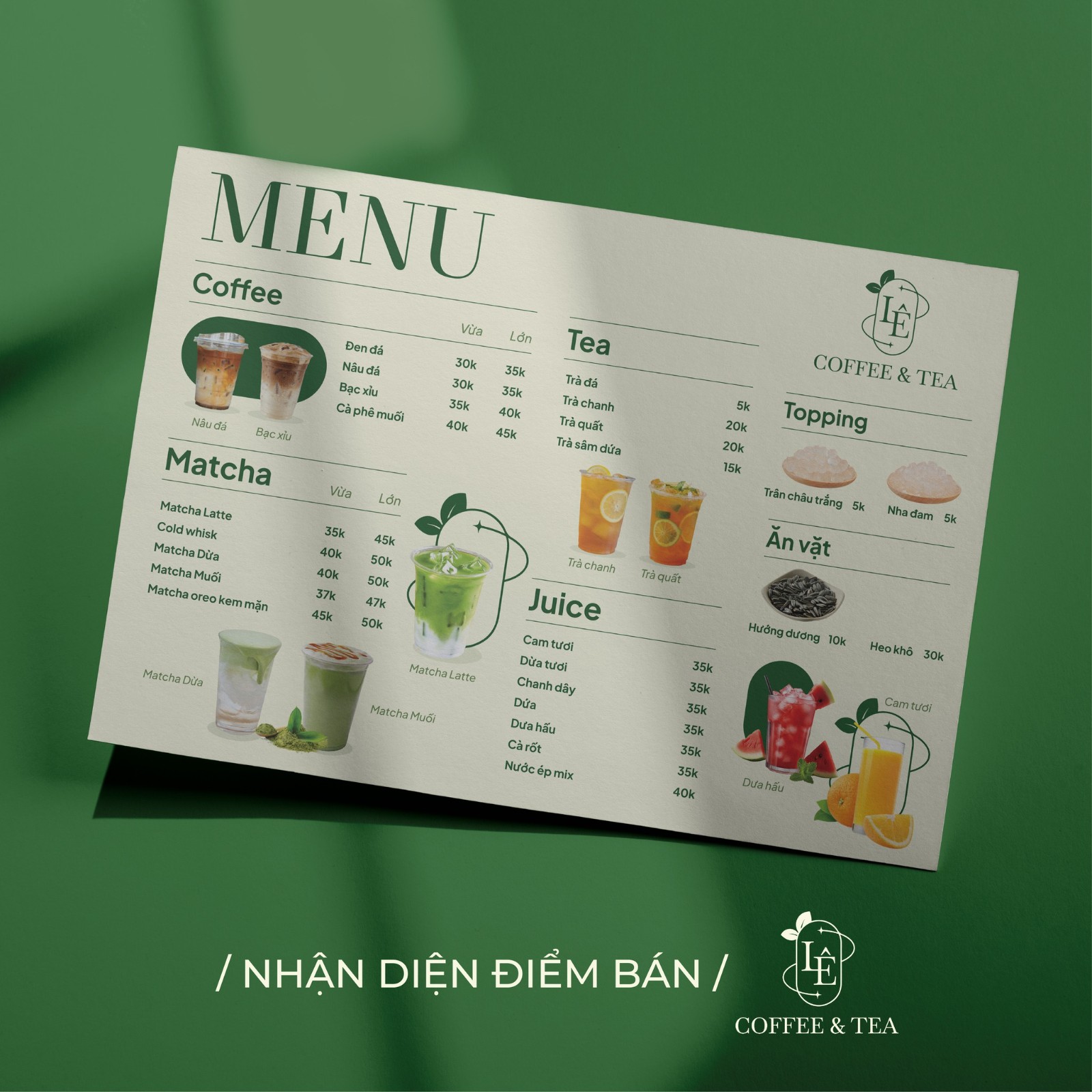 Bố cục menu được sắp xếp rõ ràng theo từng nhóm đồ uống: Coffee, Matcha, Tea, Juice, Topping & Ăn vặt, giúp khách dễ chọn, dễ gọi, dễ quyết định. Tone xanh chủ đạo gợi cảm giác tươi mát, tự nhiên, rất phù hợp với các concept quán cà phê - trà hiện đại. Hình ảnh đồ uống được xử lý vừa đủ, không phô trương nhưng vẫn đủ “kích thích vị giác”, tạo cảm giác ngon miệng và thân thiện.
