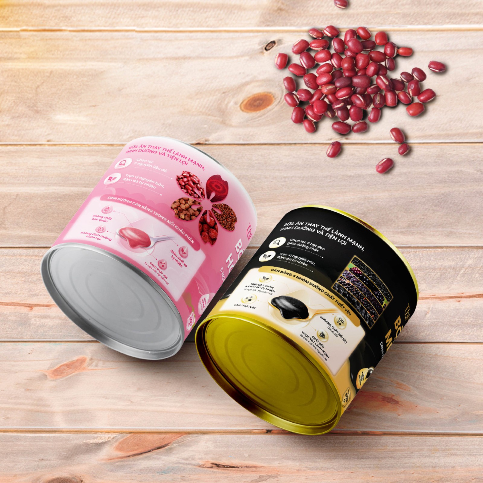 Dạng lon thiếc nắp bật giúp sản phẩm vừa đẹp mắt khi trưng bày, vừa tiện dụng và bảo quản tốt. Thiết kế nội dung tối giản, trực quan, tập trung vào tên sản phẩm nổi bật và biểu tượng công dụng (không đường, nguyên liệu tự nhiên, bổ dưỡng).