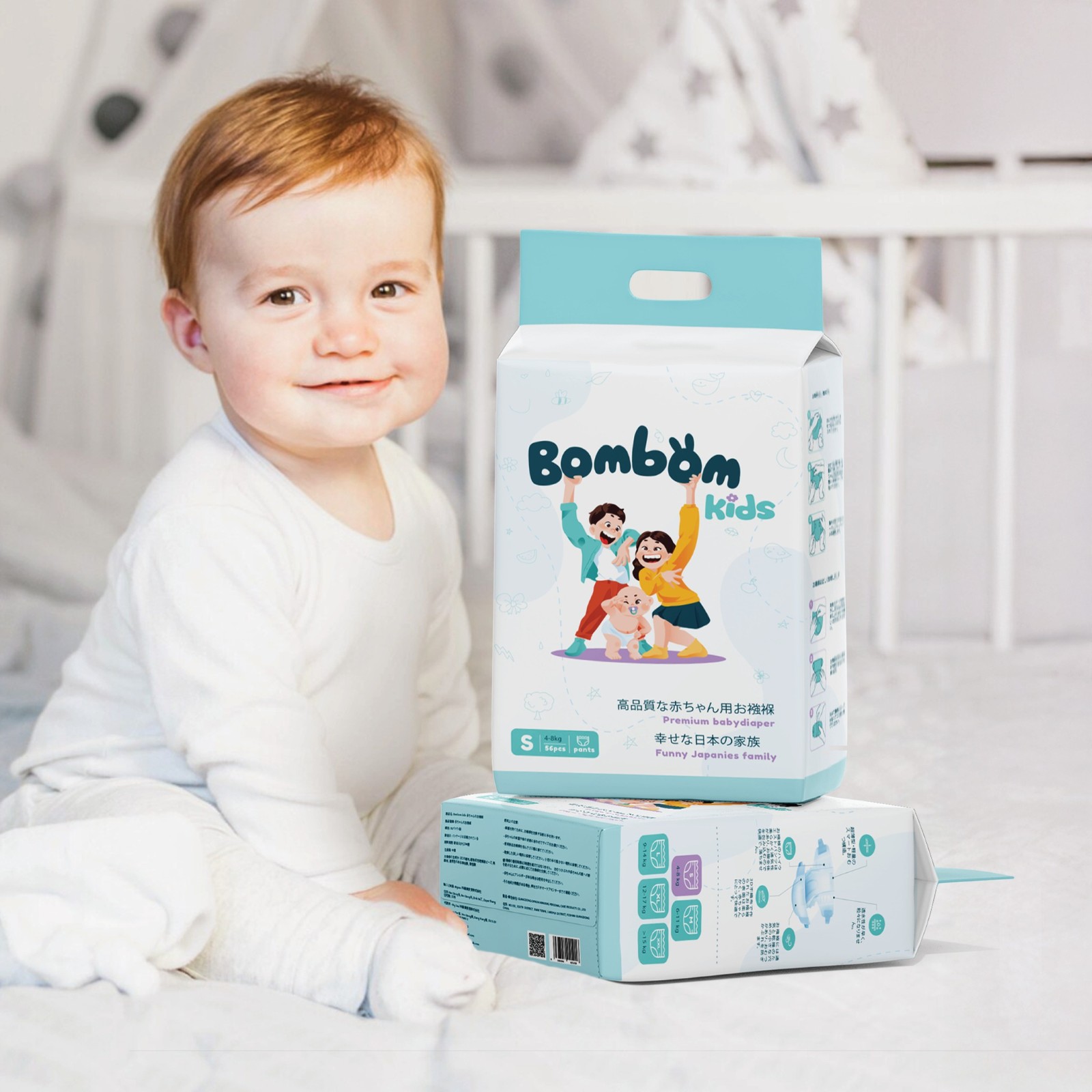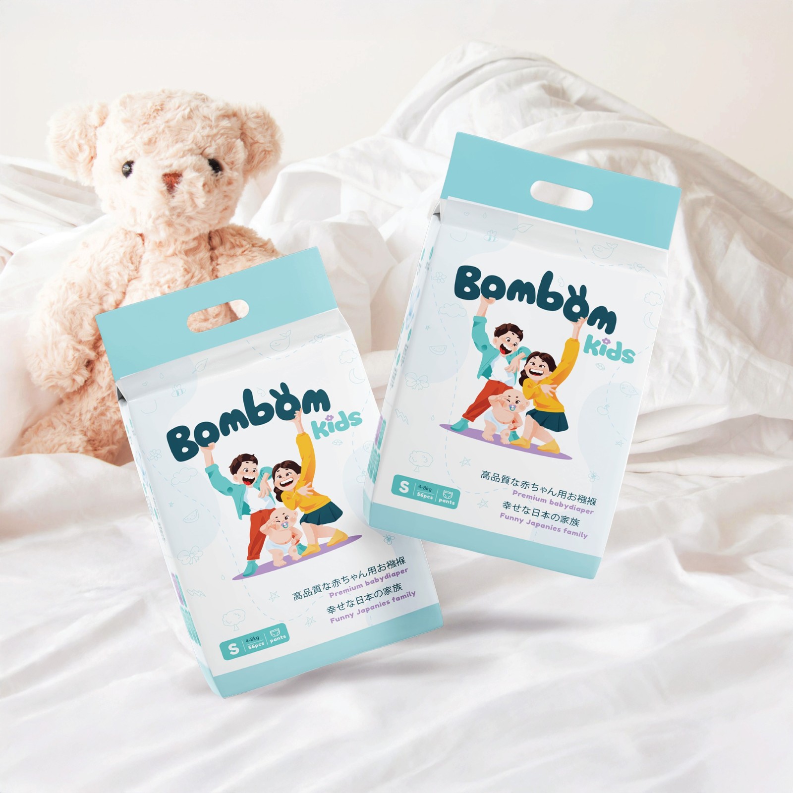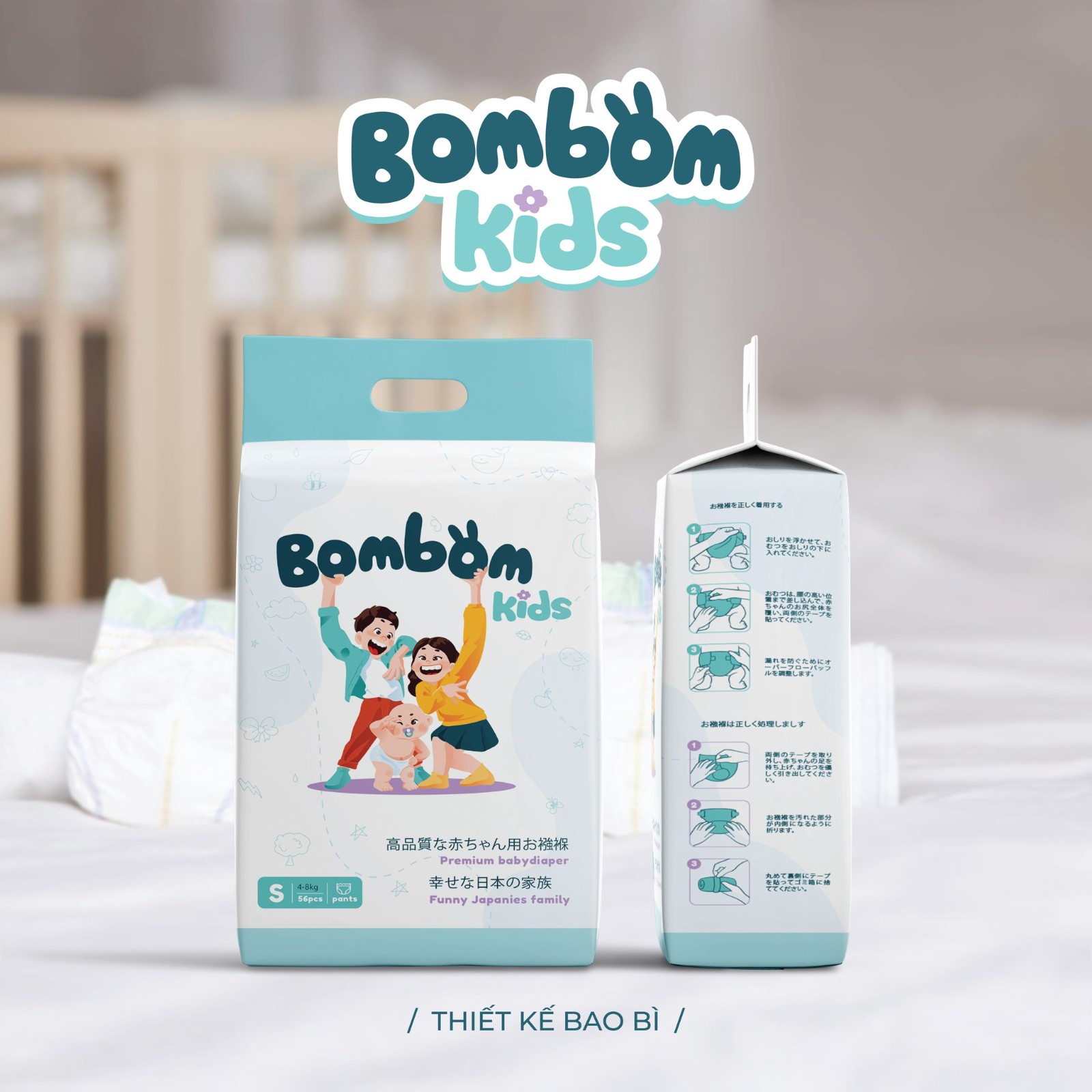 Bao bì Bombom Kids được xây dựng theo phong cách illustration dễ thương, lấy hình ảnh gia đình và em bé làm điểm nhấn cảm xúc. Những nét vẽ bo tròn, biểu cảm vui tươi giúp sản phẩm trở nên thân thiện ngay từ ánh nhìn đầu tiên, đặc biệt phù hợp với đối tượng khách hàng là các bậc phụ huynh trẻ. Gam màu xanh pastel chủ đạo mang lại cảm giác sạch sẽ, nhẹ nhàng và tin cậy đúng với tinh thần của một sản phẩm chăm sóc cho bé.