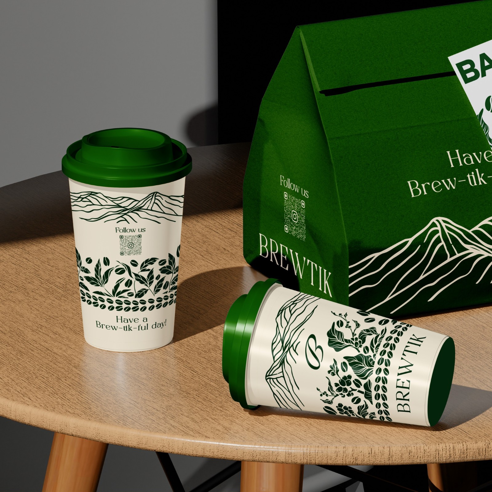 Phần logo chữ BREWTIK được đặt nổi bật trên thân cốc, kết hợp cùng họa tiết trang trí chạy vòng quanh tạo nên sự cân đối thị giác. Khi cầm trên tay, chiếc cốc không chỉ là vật dụng mà còn trở thành một “touchpoint thương hiệu” giúp khách hàng ghi nhớ và kết nối với thương hiệu cà phê theo cách tự nhiên nhất. Thiết kế cốc giấy BREWTIK là minh chứng cho việc bao bì tốt không chỉ đẹp, mà còn kể được câu chuyện thương hiệu.