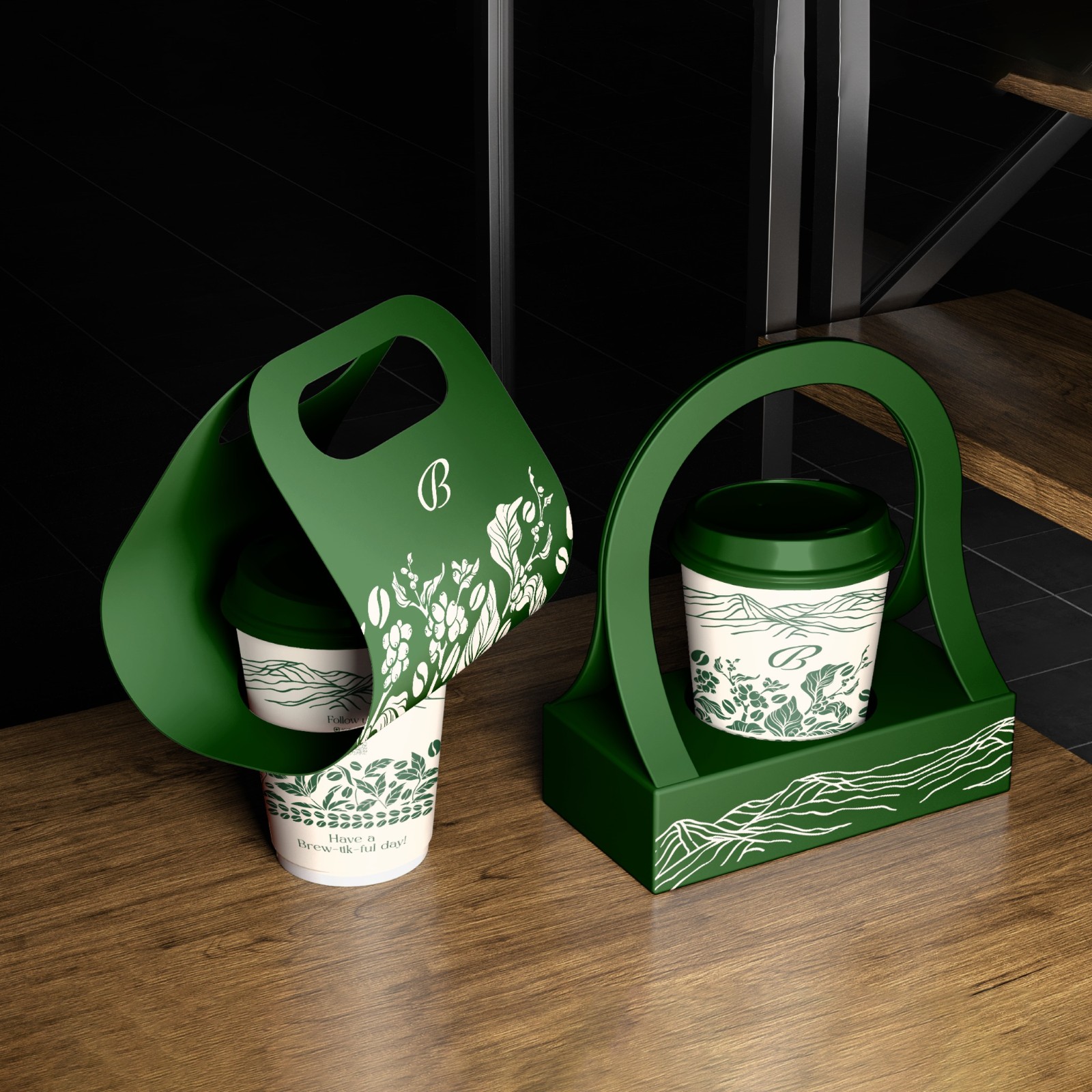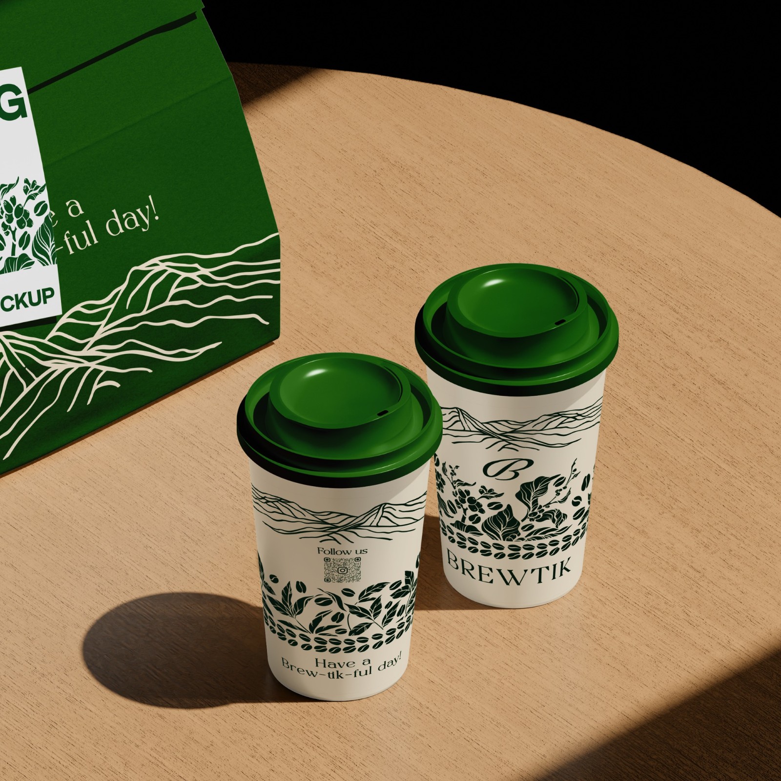 Lấy cảm hứng từ thiên nhiên và nguồn gốc hạt cà phê, thiết kế sử dụng các đường nét minh hoạ tối giản gợi hình ảnh núi đồi, cây lá và hạt cà phê đang vào mùa. Những chi tiết này được thể hiện bằng phong cách line-art tinh tế, tạo nên cảm giác gần gũi, thủ công nhưng vẫn hiện đại. Bảng màu xanh lá chủ đạo kết hợp với nền trắng giúp tổng thể thiết kế trở nên thanh lịch, sạch sẽ và dễ nhận diện phù hợp với hình ảnh một thương hiệu cà phê hướng đến sự tự nhiên và bền vững.