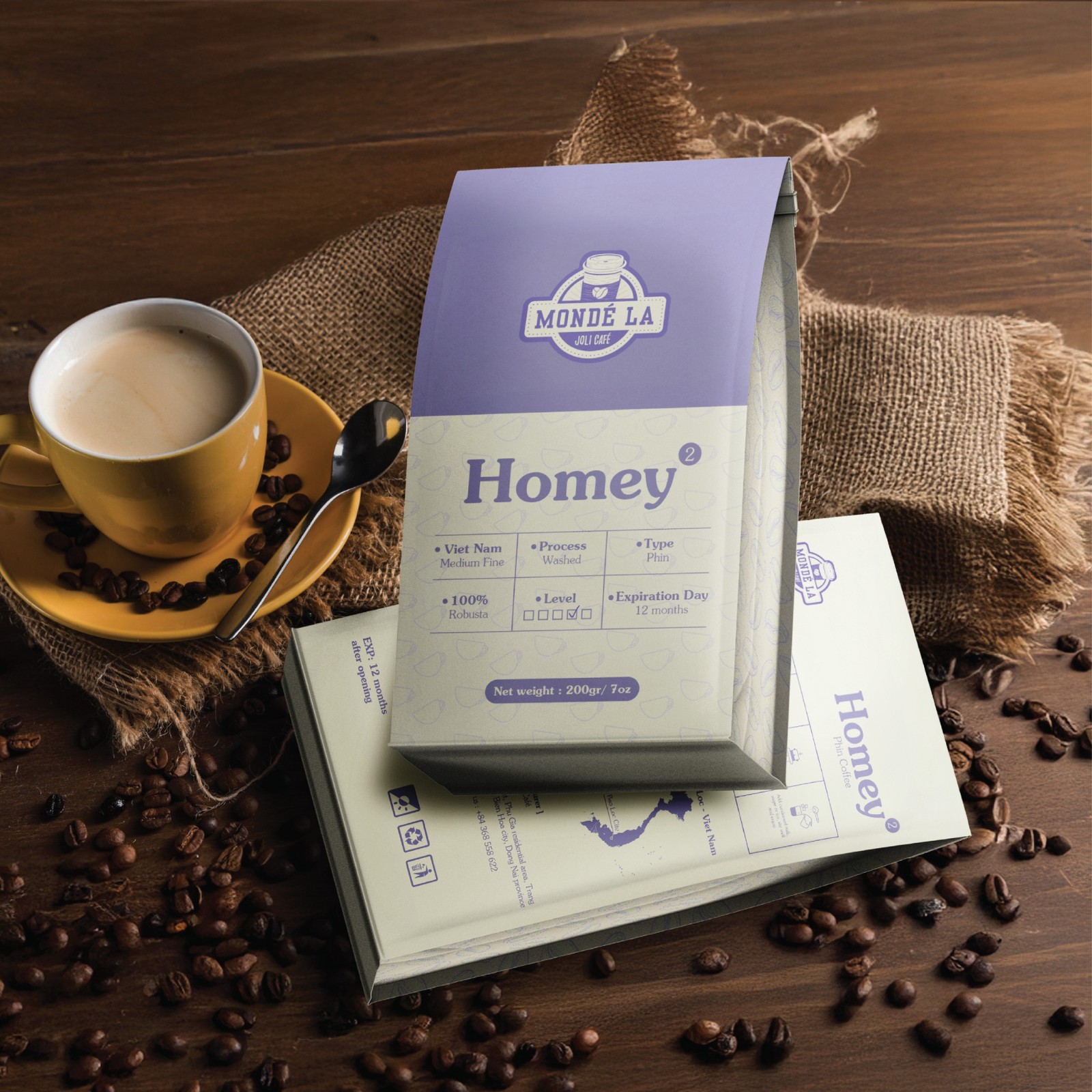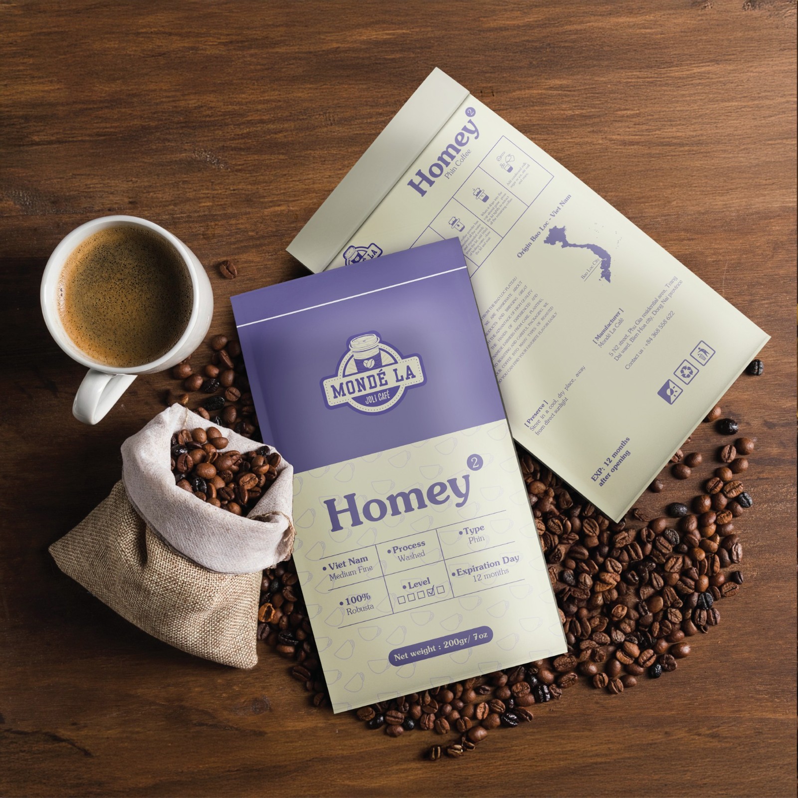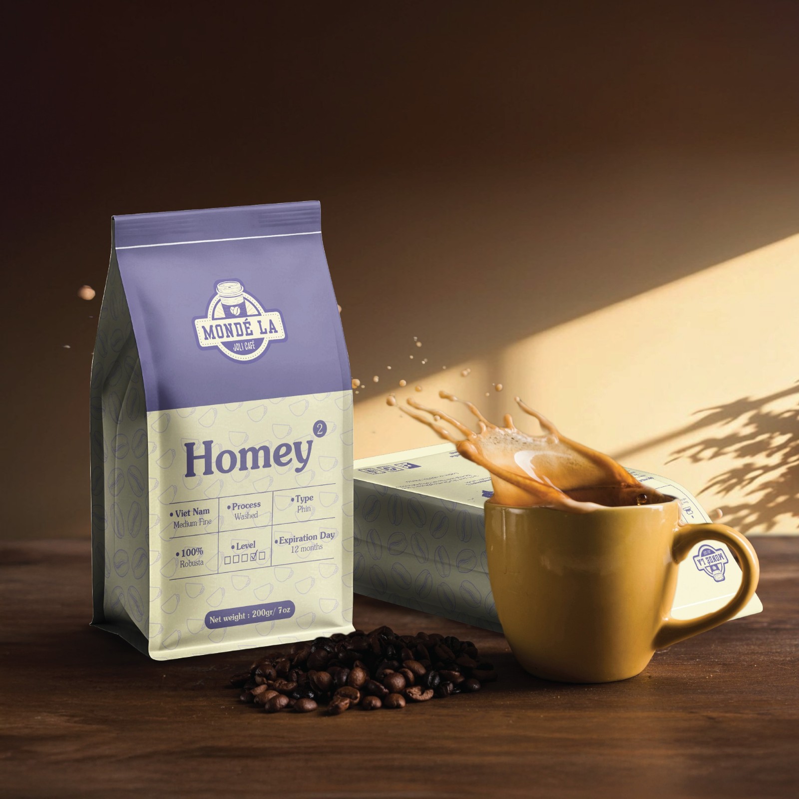 Với định hướng tối giản - tinh tế - gần gũi, thiết kế bao bì được xây dựng dựa trên tinh thần của sự thân thuộc và chân thực. Gam màu kem nhã nhặn kết hợp sắc tím dịu mang đến cảm giác ấm áp, nhẹ nhàng, như cách mà Homey chạm đến trái tim những người yêu cà phê truyền thống.