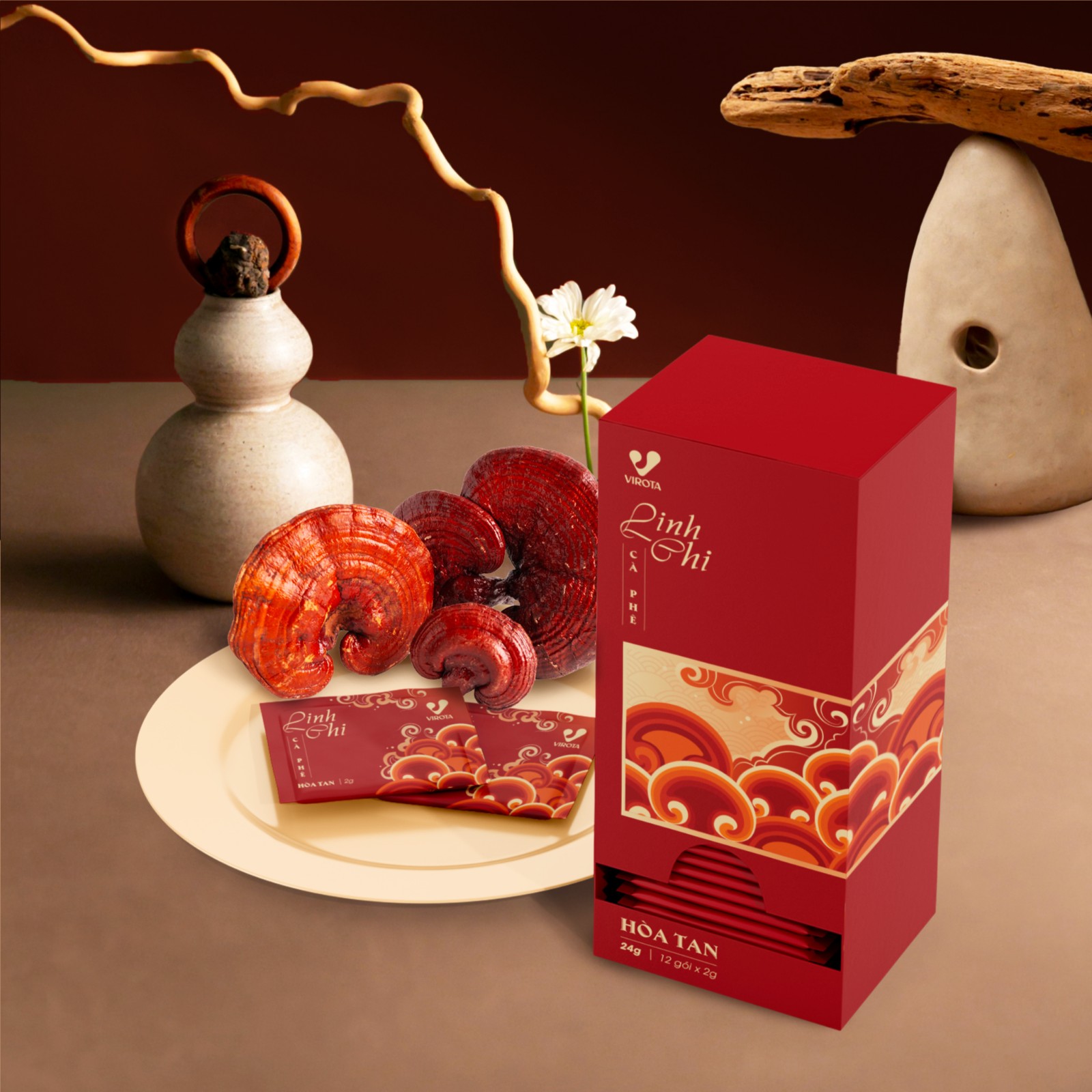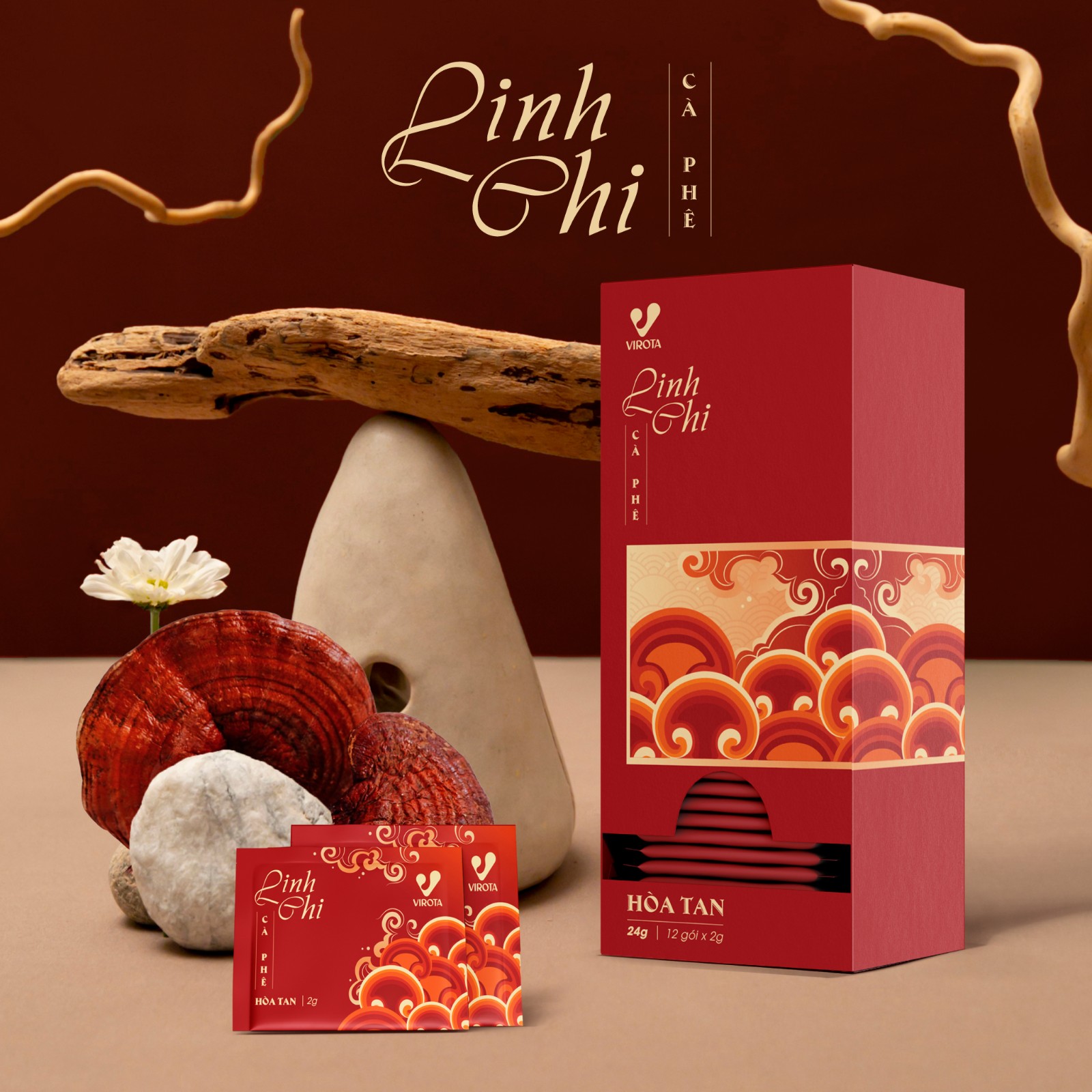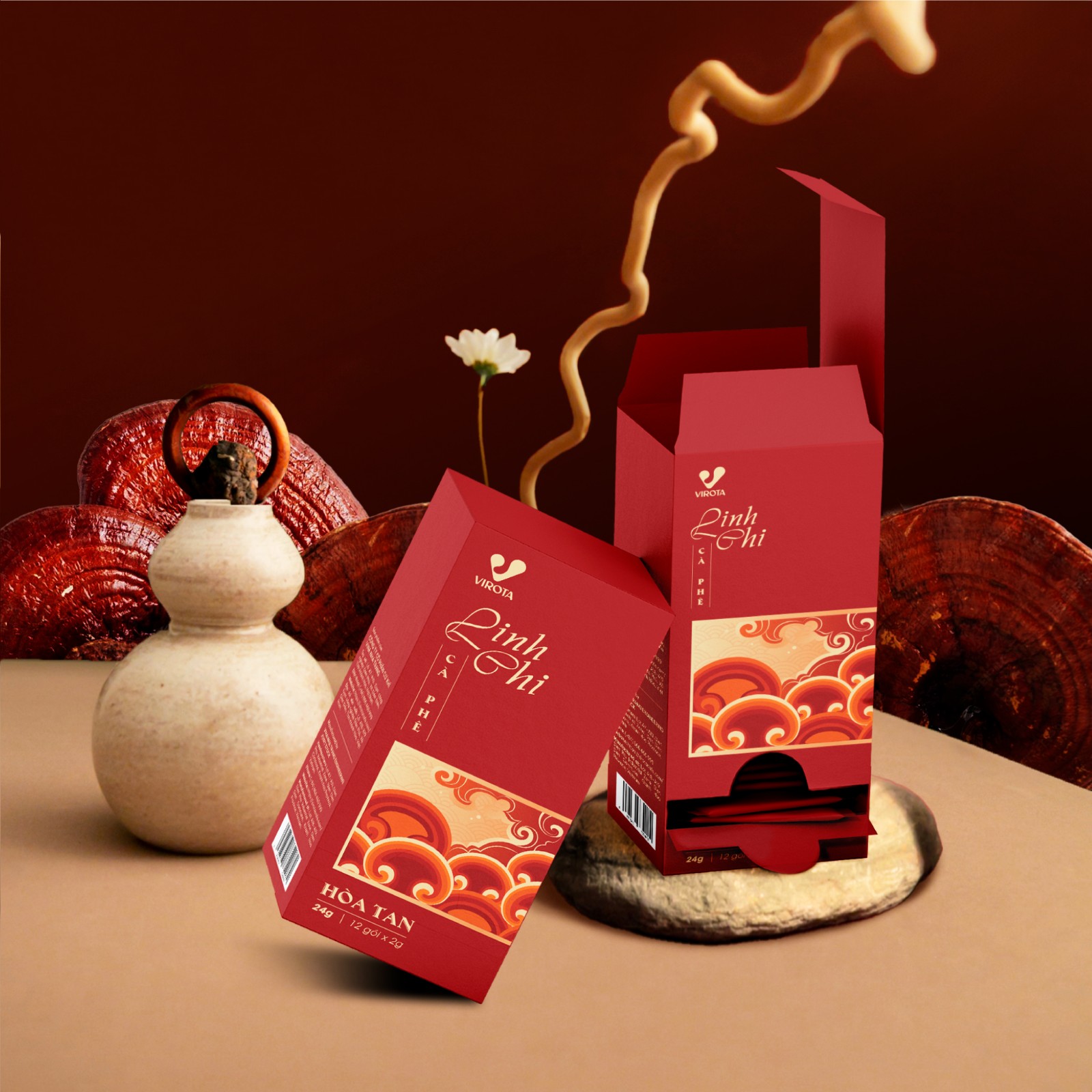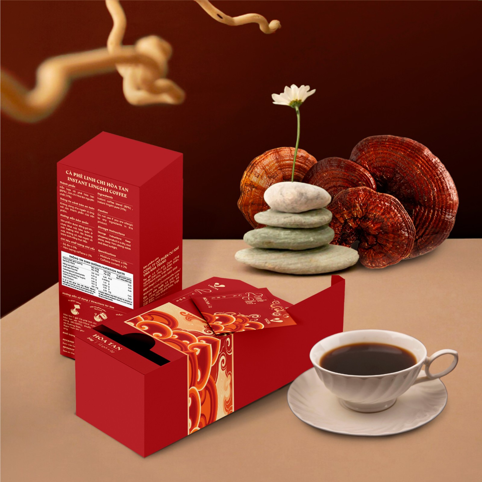 Bao bì được xây dựng trên nền sắc đỏ trầm - gam màu gợi liên tưởng đến sự thịnh vượng, năng lượng và chiều sâu văn hóa Á Đông. Trên nền đó, họa tiết sóng mây cách điệu được triển khai như một ngôn ngữ trang trí mang tính biểu tượng, vừa gợi cảm giác chuyển động, vừa tạo nhịp điệu thị giác sang trọng. Những đường cong mềm mại không chỉ làm giàu thẩm mỹ, mà còn ẩn dụ cho sự lan tỏa của hương vị và năng lượng của cà phê kết hợp linh chi.