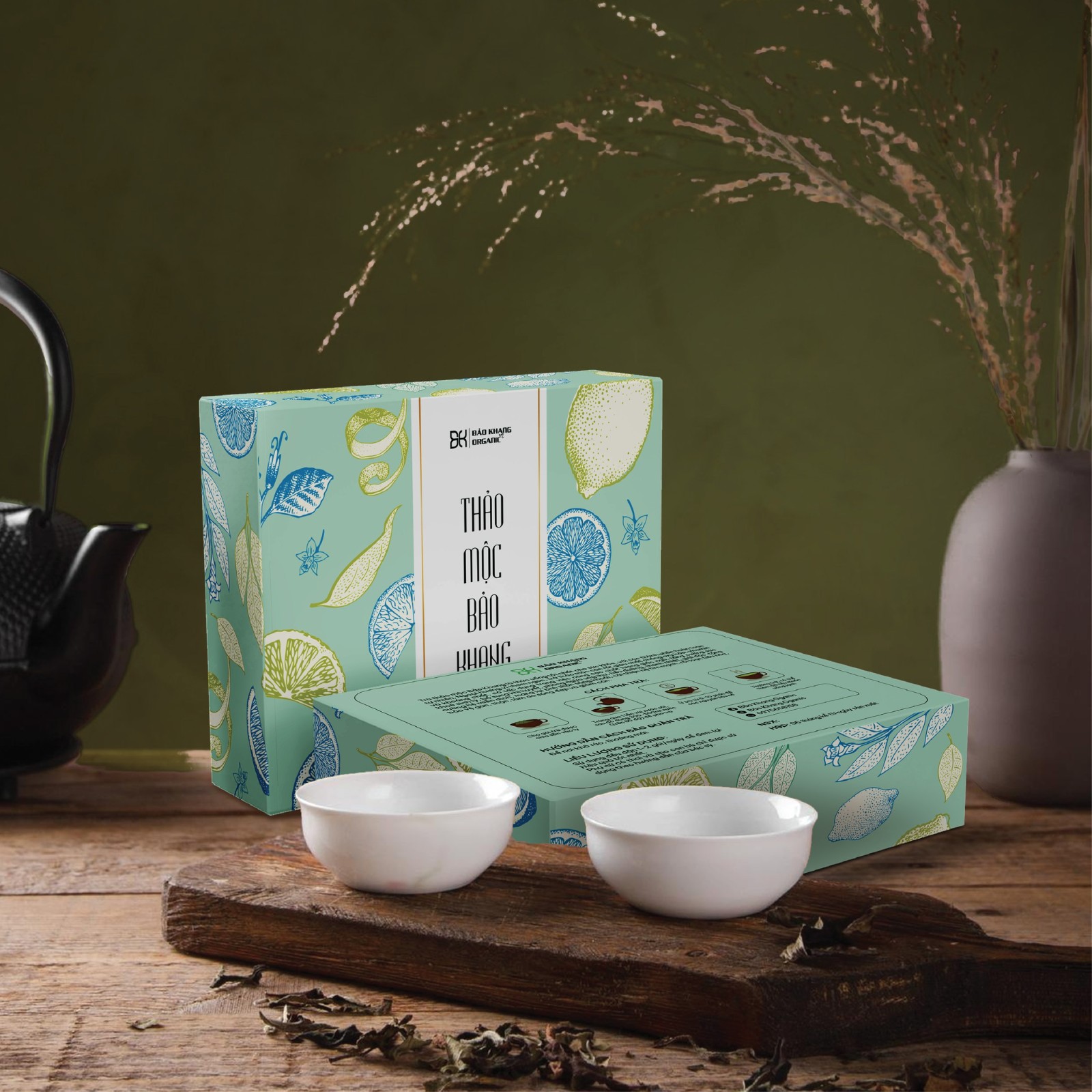 Để cân bằng lại sự phong phú của họa tiết, tên sản phẩm được đặt trên nền trắng tinh khôi, sử dụng phông chữ serif trang nhã, tạo cảm giác sang trọng và đáng tin cậy. Thiết kế này thành công trong việc tạo ra một lớp vỏ ngoài không chỉ bảo vệ sản phẩm mà còn định vị "Thảo Mộc Bảo Khang" như một món quà sức khỏe tinh tế, thể hiện kỹ năng kết hợp hài hòa giữa yếu tố truyền thống và thẩm mỹ hiện đại của Bee Art.