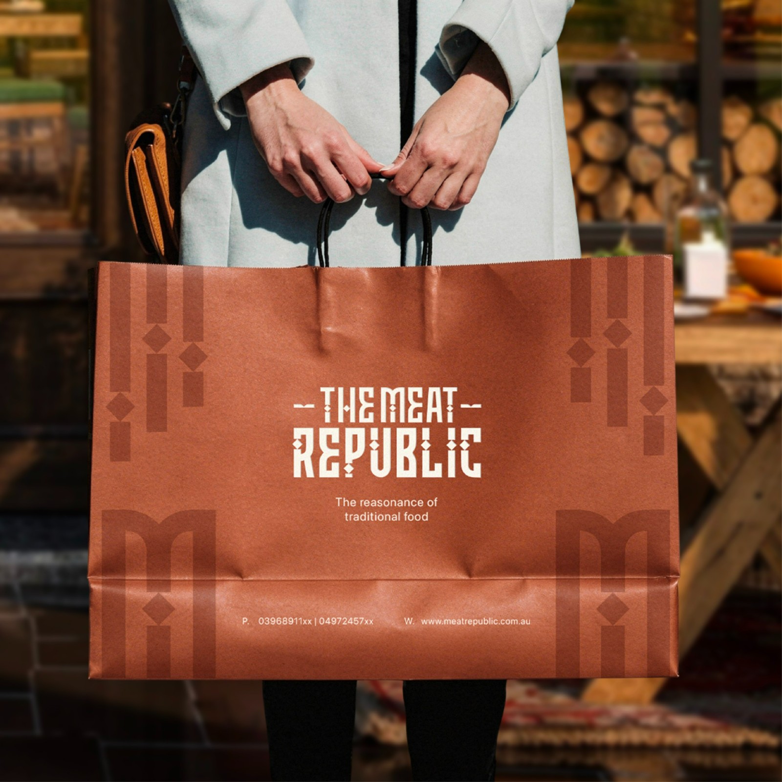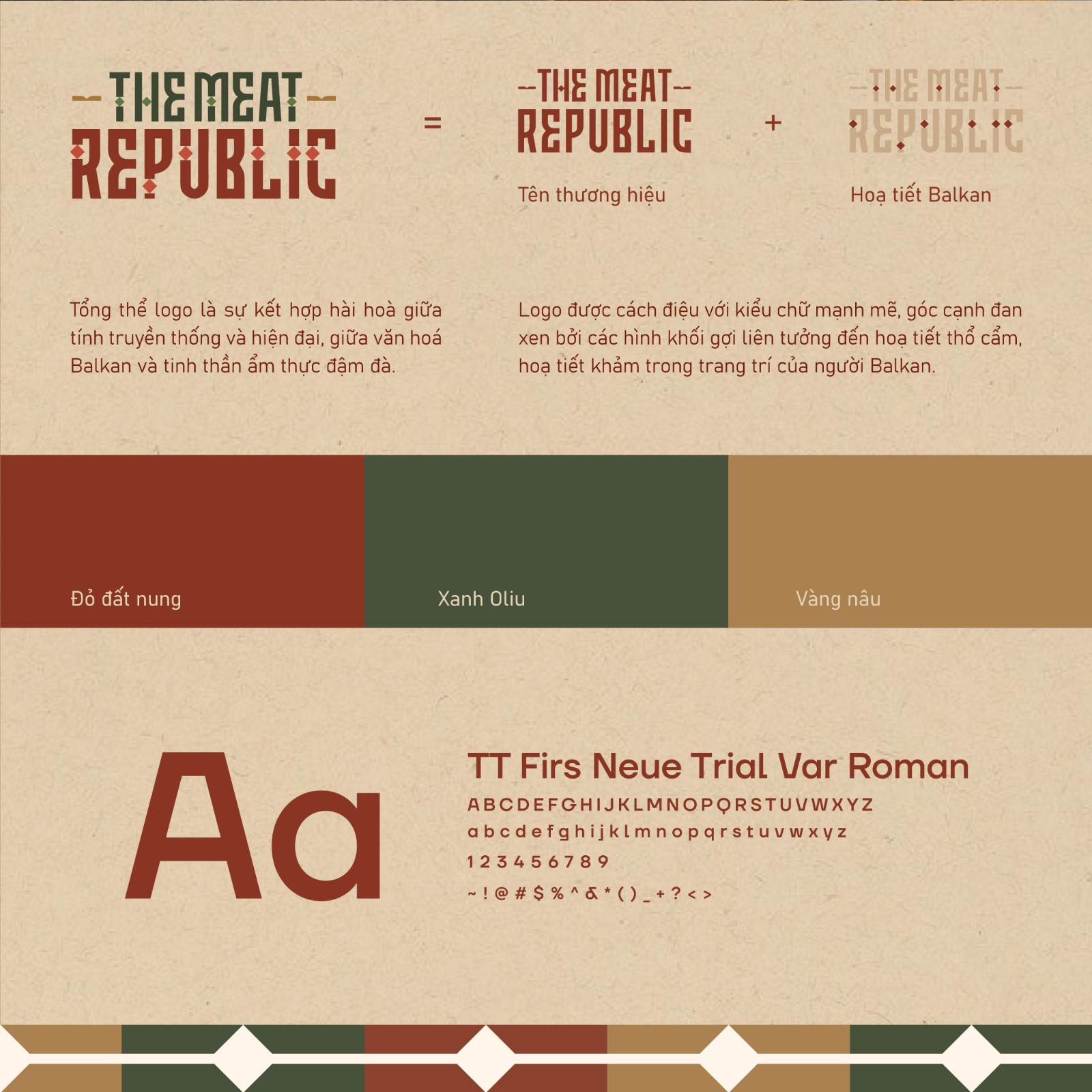 Bảng màu nâu đất và xanh olive bao phủ logo trong một sắc thu trầm ấm. Đó là màu của gỗ già, của than hồng âm ỉ, của ánh lửa bập bùng trong những buổi tối quây quần bên bàn ăn. Những gam màu ấy không chỉ gợi nhắc đến hương vị đậm đà của món nướng, mà còn đánh thức cảm giác thân thuộc, như thể mỗi lần nhìn thấy đều là một lần trở về nhà.