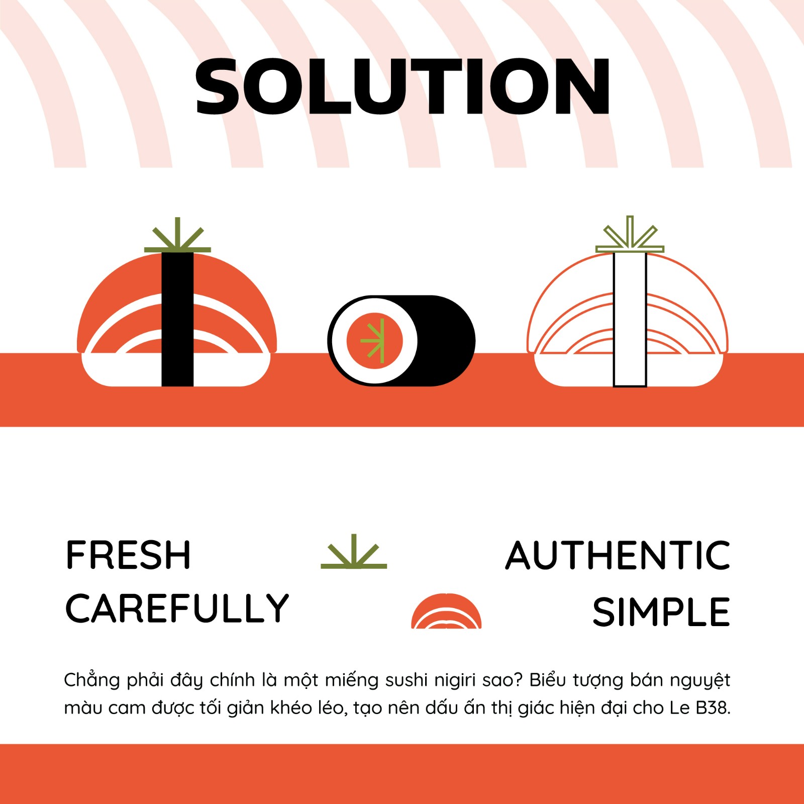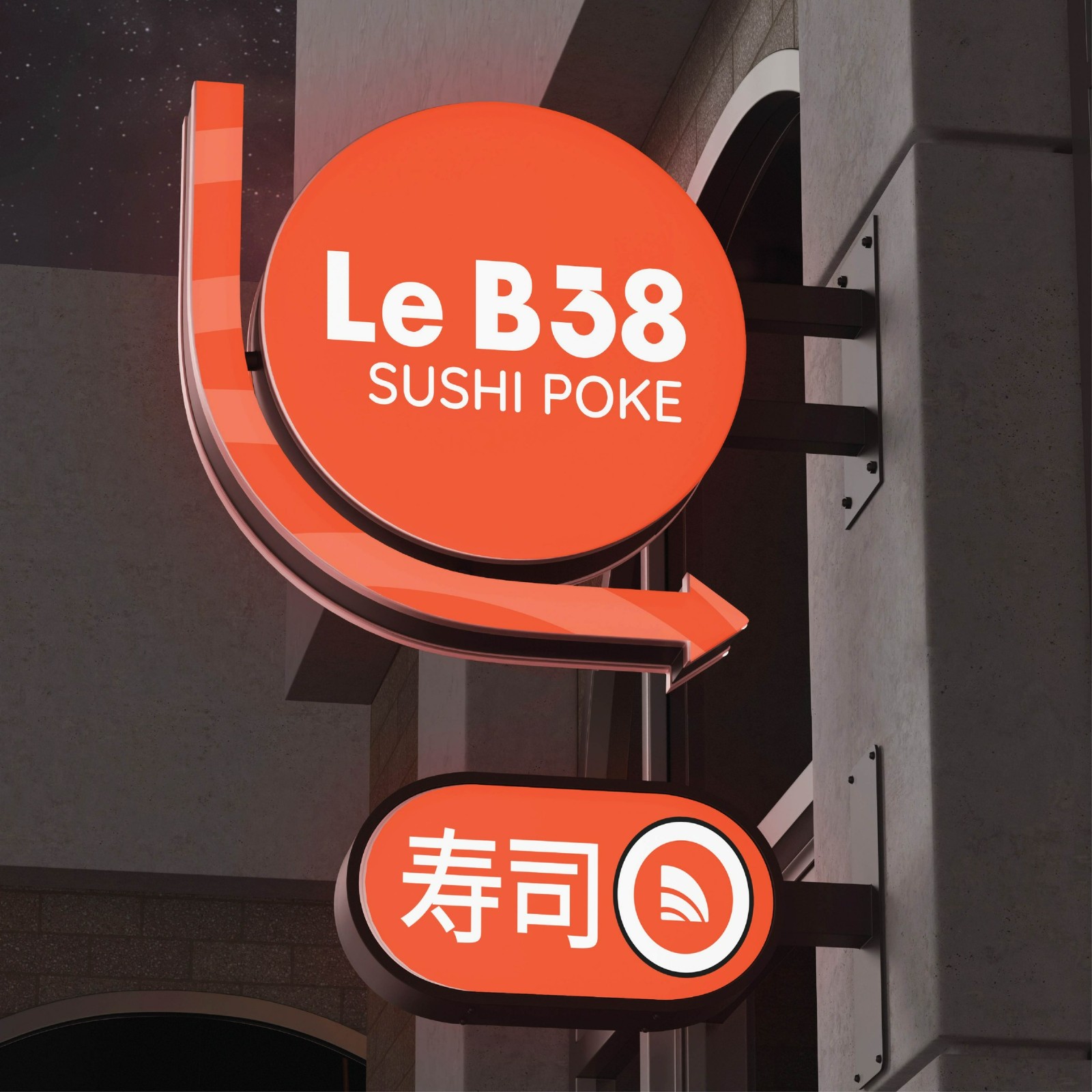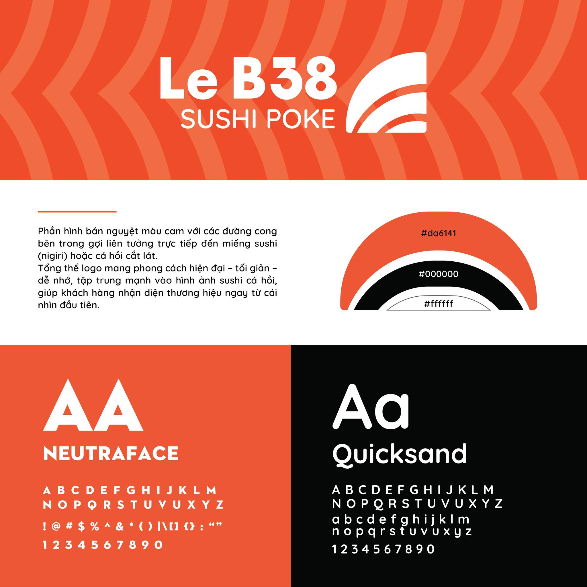 Ở trung tâm logo là biểu tượng bán nguyệt màu cam với những đường cong mềm mại. Hình khối gợi liên tưởng đến miếng sushi nigiri quen thuộc, một biểu tượng đặc trưng của ẩm thực Nhật. Hình ảnh được lược giản thành ngôn ngữ thiết kế tinh gọn và giàu tính tượng hình. Le B38 hứa hẹn sẽ là thiên đường ẩm thực dành cho những ai say mê hương vị sushi tươi ngon và văn hóa ẩm thực Nhật Bản tinh tế.