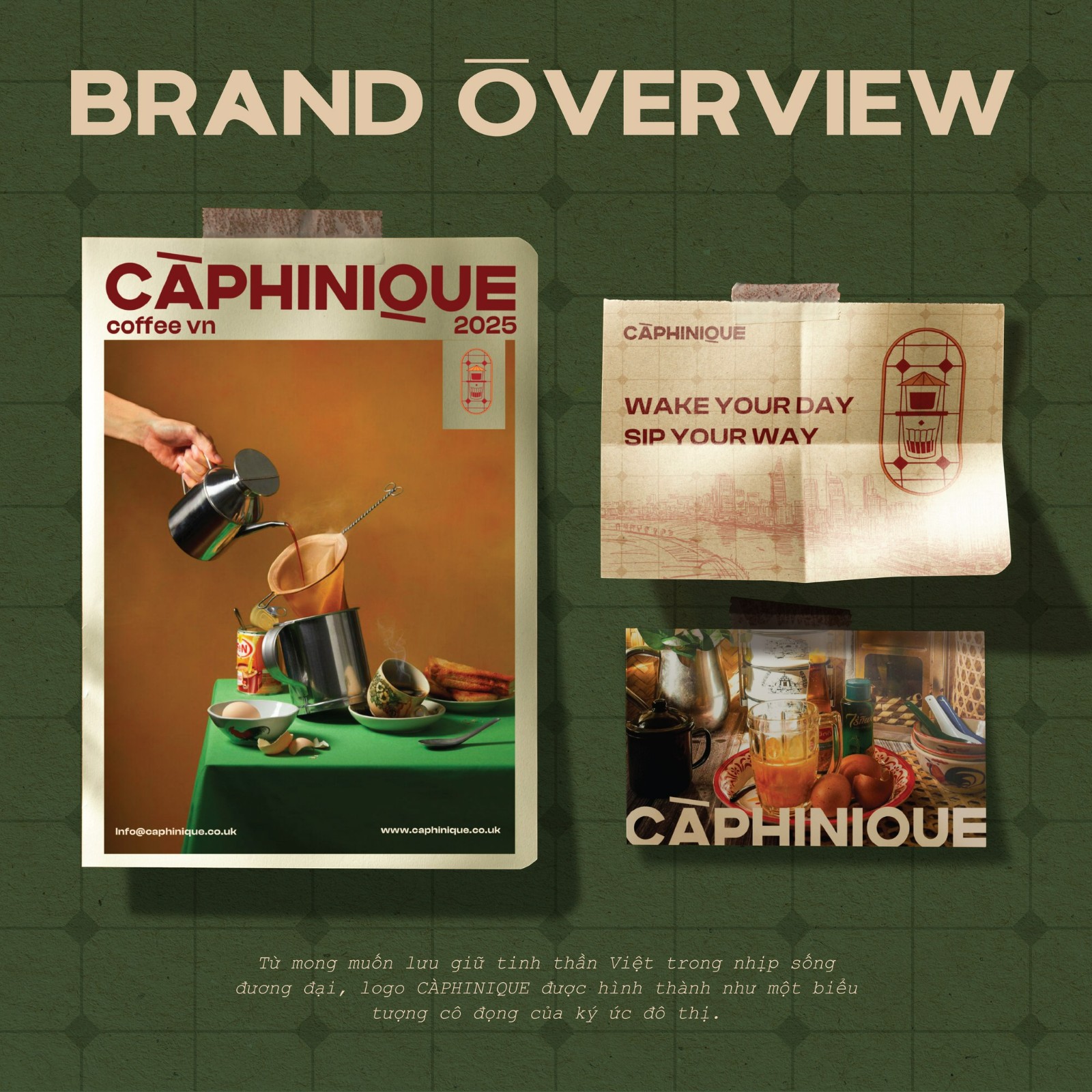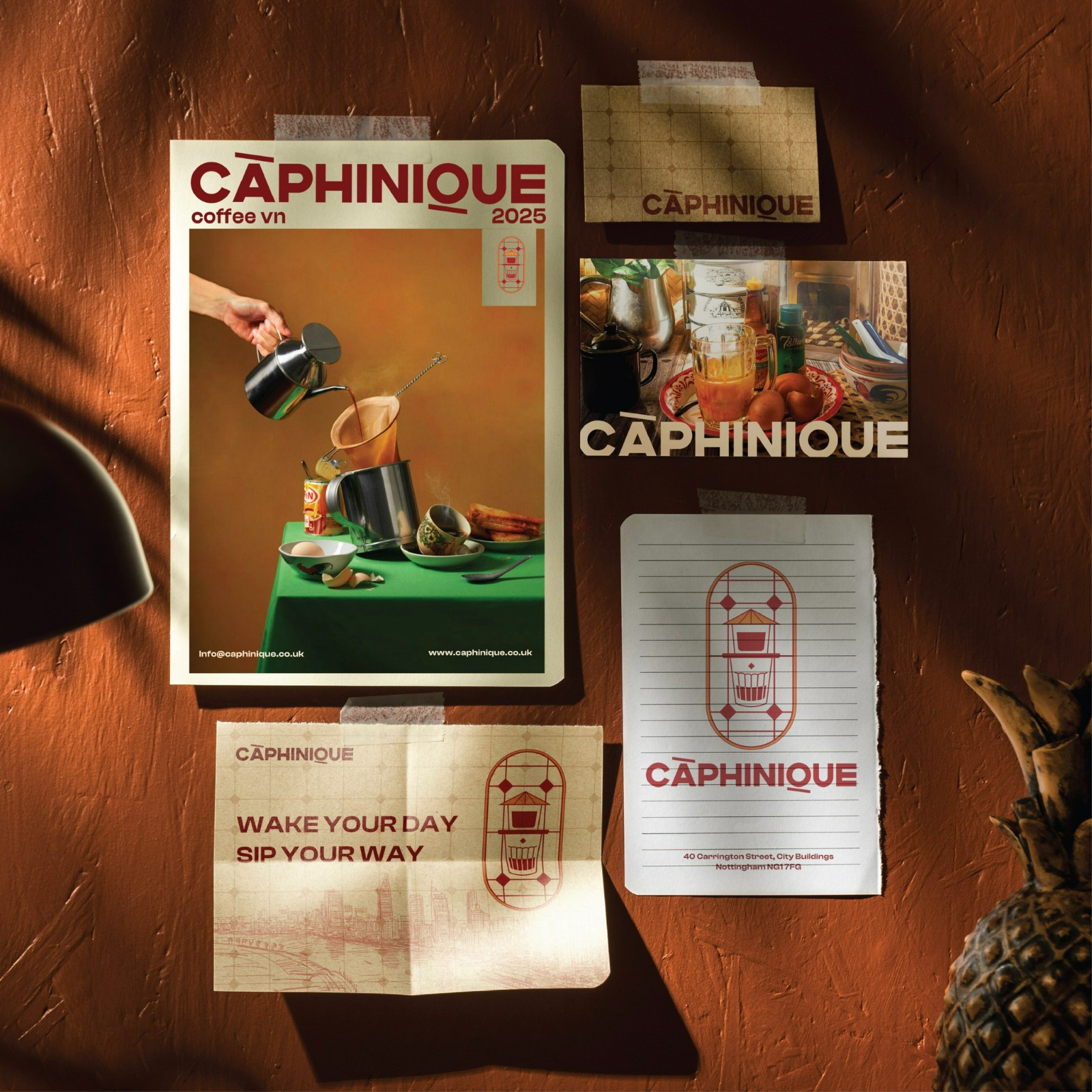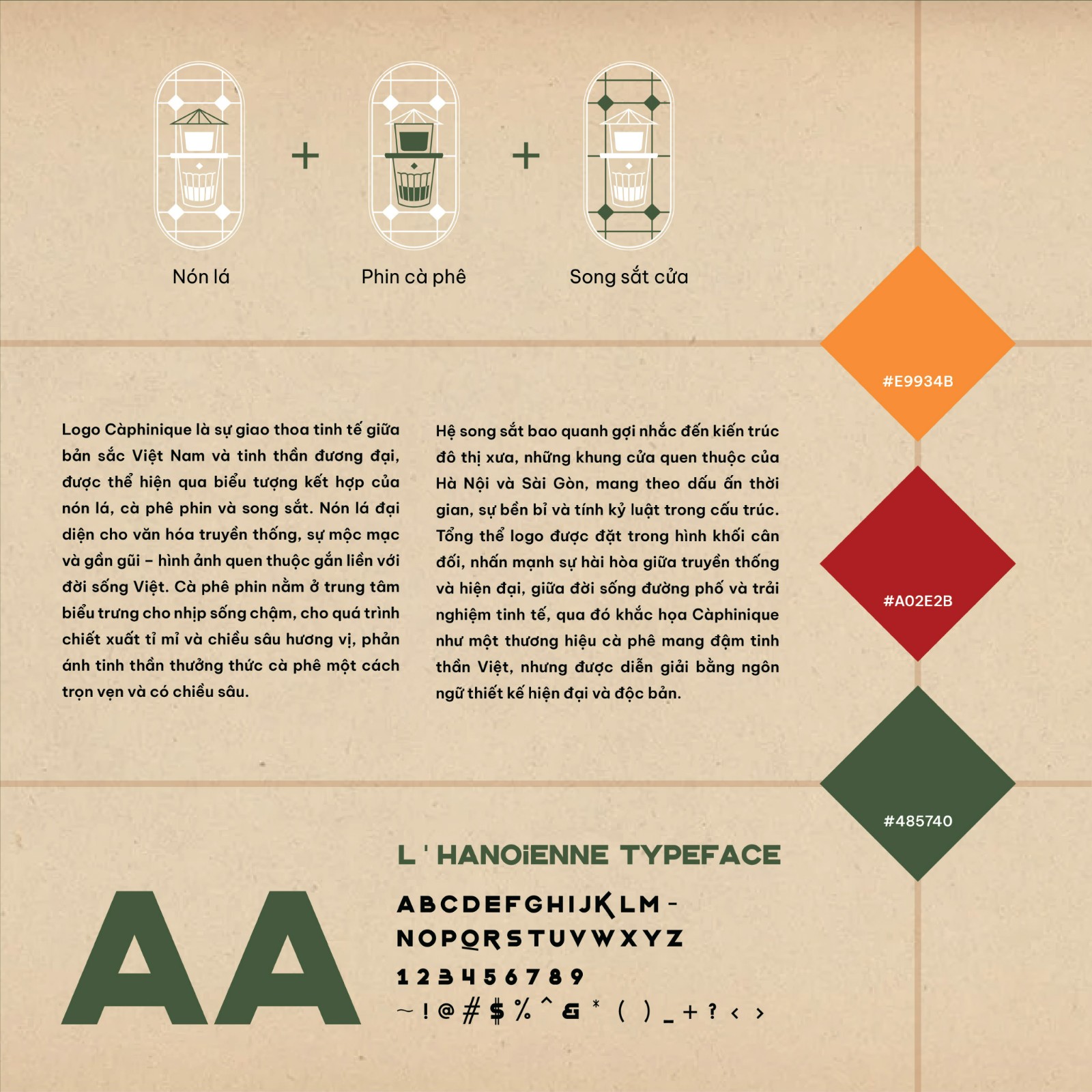 Từ mong muốn lưu giữ tinh thần Việt trong nhịp sống đương đại, logo CÀPHINIQUE được hình thành như một biểu tượng cô đọng của ký ức đô thị. Không kể chuyện bằng hình ảnh rời rạc, thiết kế lựa chọn cách chắt lọc những biểu trưng quen thuộc và sắp đặt chúng trong một cấu trúc hình học có chủ đích.