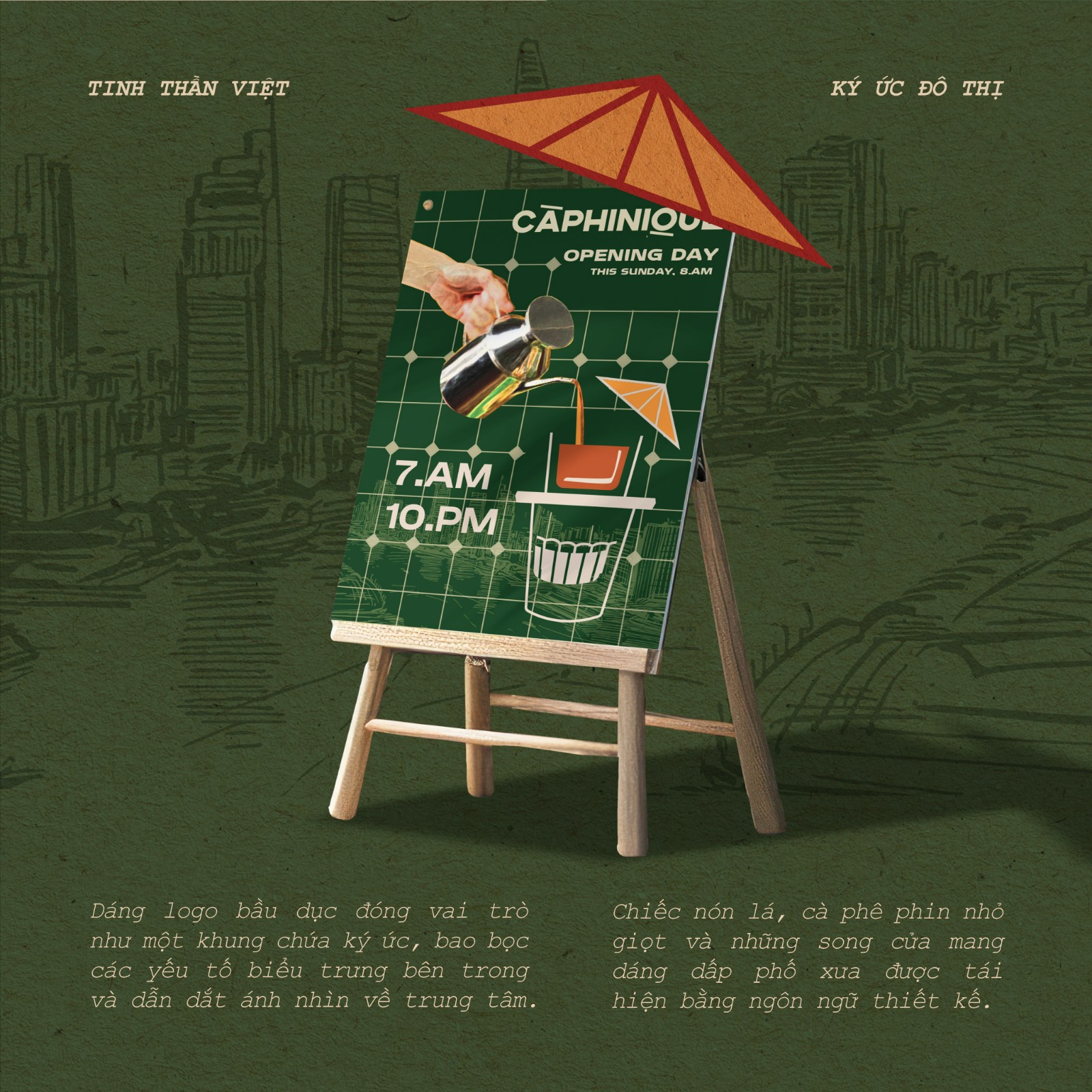 Chiếc nón lá, cà phê phin nhỏ giọt và những song cửa mang dáng dấp phố xưa được tái hiện bằng ngôn ngữ thiết kế. Dáng logo bầu dục đóng vai trò như một khung chứa ký ức, bao bọc các yếu tố biểu trưng bên trong và dẫn dắt ánh nhìn về trung tâm. Tại đó, hình ảnh cà phê trở thành điểm neo thị giác, làm tôn lên nét độc đáo của thiết kế.